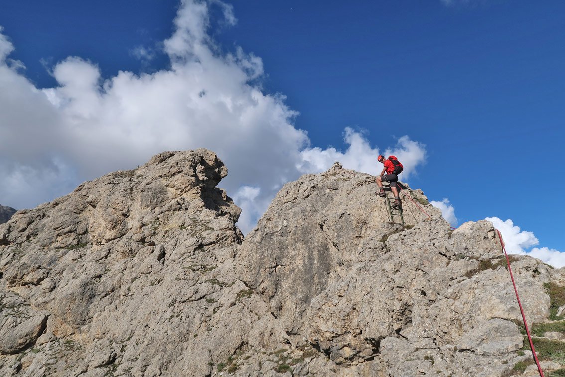 Für seine vermutlich primär nicht kletternden Gäste ein tolles Abenteuer – für Liebhaber von Dolomiten-Klassikern aber ein NICHT hinnehmbarer Tatbestand. Im UNESCO Weltnaturerbe (den Dolomiten) sollte man behutsam mit Veränderungen vorgehen. Die Bohrhaken an den Standplätzen und dazwischen sind noch vertretbar, mit den großen geklebten Griffen (die noch dazu nicht wirklich etwas bringen) schießt man aber mehr als deutlich über das Ziel hinaus!