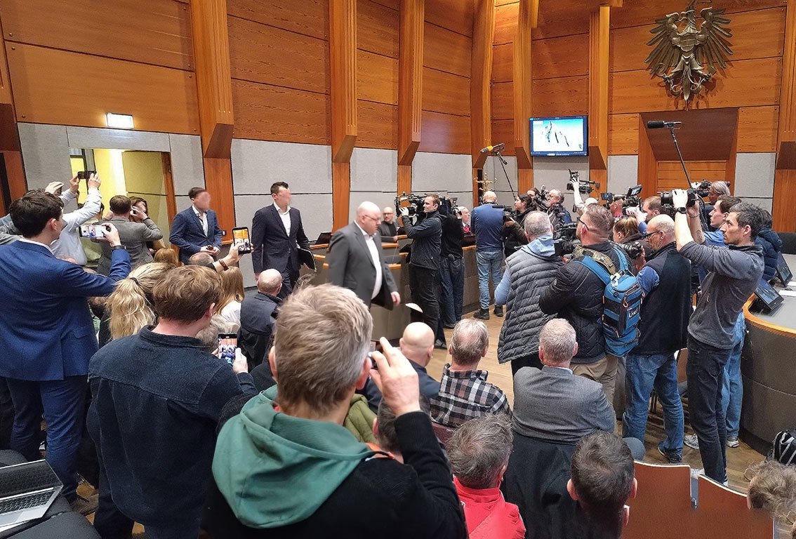 Der Angeklagte Thomas P. betritt hinter seinen beiden Verteidigern unter enormen Medieninteresse den Gerichtssaal
