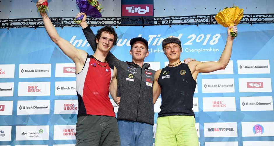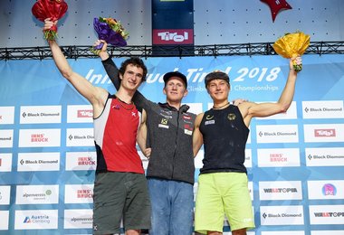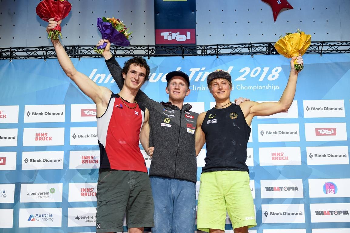 Adam Ondra, Jakob Schubert und Alexander Megos auf dem Siegertreppchen. (Foto: EXPA Pictures/Erich Spiess)