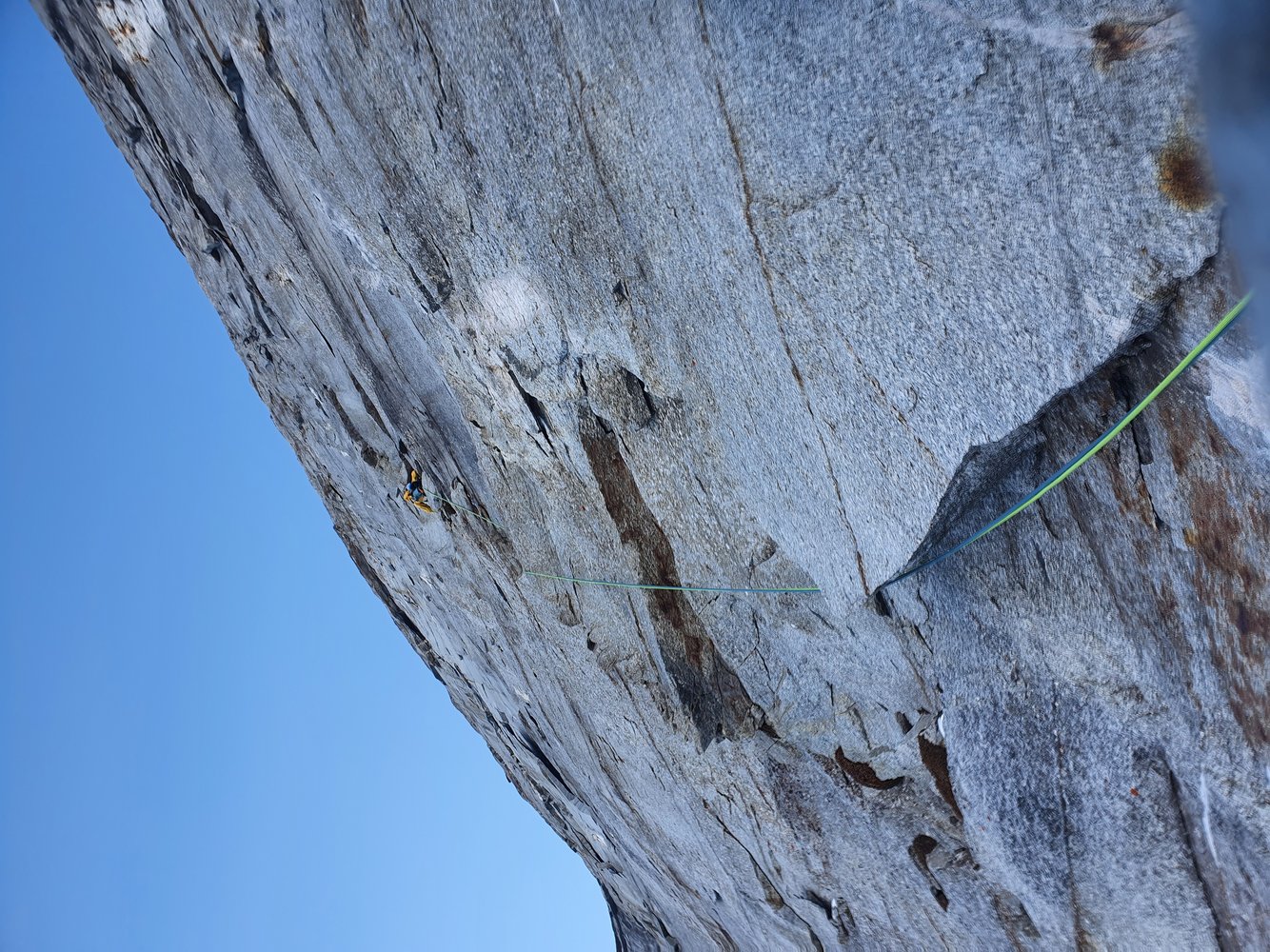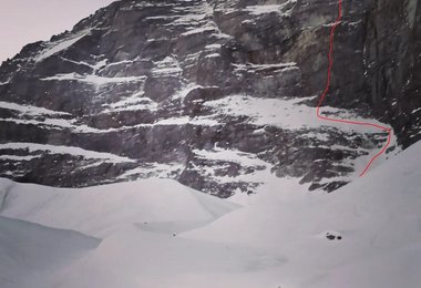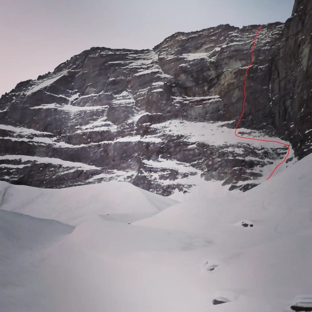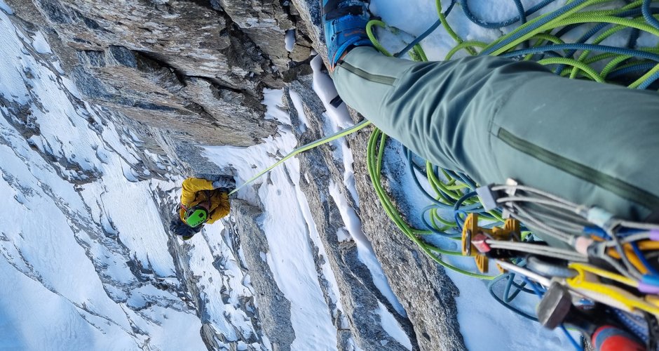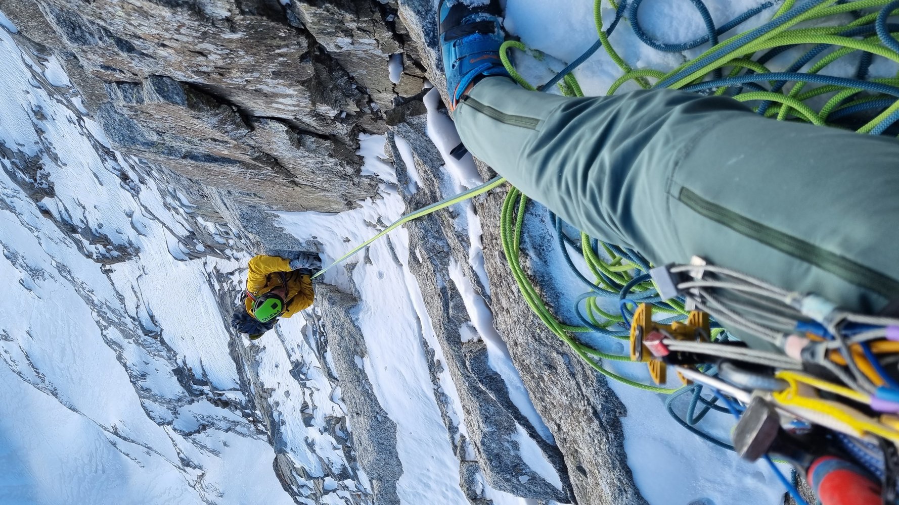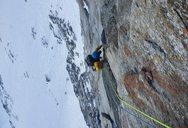 Diesmal starteten Martin Sieberer und ich früh auf Skiern, stiegen mit Bergschuhen, Steigeisen und Eispickel die dominante Schneerampe hinauf, um dann in Kletterschuhen weiterzugehen (als Backup hatten wir für beide ein Paar Stiefel, Steigeisen und Eispickel dabei, sowie zwei Müsliriegel und je 800ml Flüssigkeit, um so leicht wie möglich zu sein) und diese Taktik ging auf.