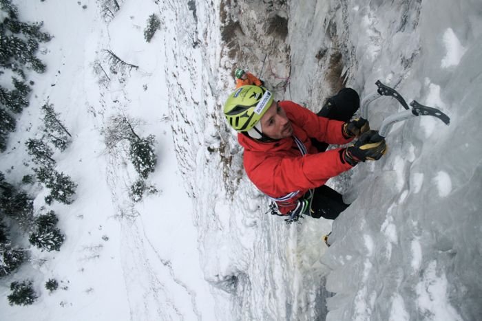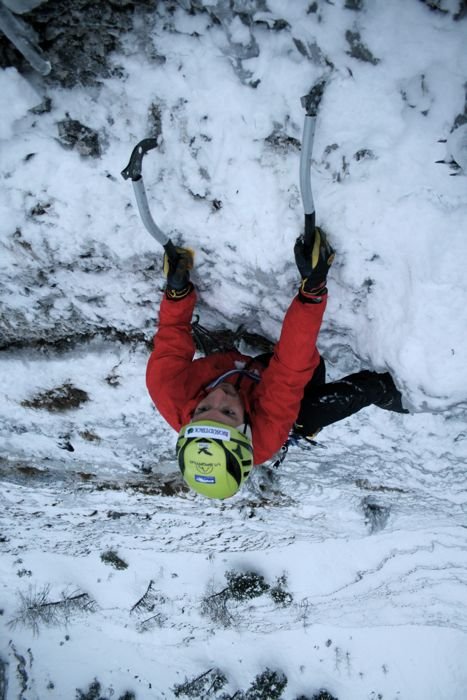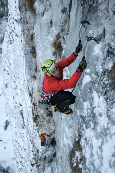 Ich bin etwas nervös als ich unters Dach hinkomme, bin mir über die richtigen Griffkombinationen nicht sicher und muss improvisieren. Es kommt mir vor ich verliere das Gefühl für Zeit und Raum. Ich klettere einfach. Auf einmal stehe ich beim Standplatz. Ich hatte heute Glück, dass meine Eispickel nie vom Fels und dünnen Eis abrutschten.