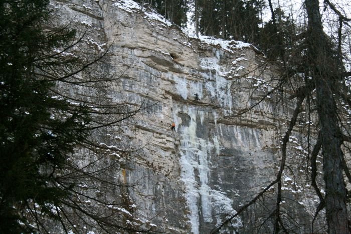 Nächster Versuch: Diesmal ist Tamara mit dabei. Es ist sehr kalt doch die Eisverhältnisse gut. Wir klettern bis zum letzen Standplatz hoch, um dort weiter zu klettern. Unser Ziel ist es heute den Ausstieg zu erreichen, noch ungefähr 50 Meter sind dabei zurückzulegen. Eine sehr schwierige Länge steht uns bevor.