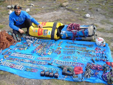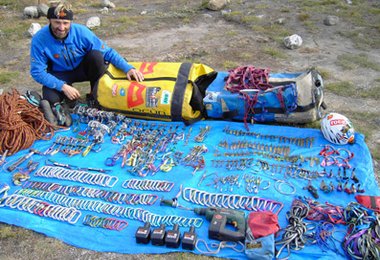 385m Seile, 156 Karabiner, 54 Friends, 2 Sätze Keile, 31 Copperheads, 25 Beaks, 64 Haken, 20 Hooks, Bohrmaschine mit 5 Akkus, Bohrzeug, Schlingen, Trittleitern, Hammer, Jümars, Grigri, Haul-Zeug, Kletterschuhe
