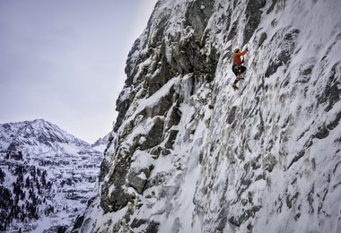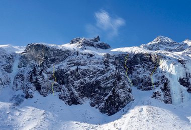 Aller guten Dinge sind drei und dieses Maß voll machte die anspruchsvollste und beeindruckendste dieser Routen, die „Triptychon“. Im Jänner 2016 schaffen Günther Göberl und die ersten drei Seillängen. Erst ein Jahr später, aus denselben Gründen wie bei der „Fahrenheit“, gelang die Fertigstellung mit Florian Dertnig, wieder einmal im Sturm.