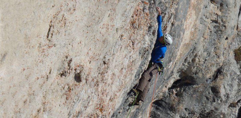 Leider fing es kurz nach dem Erreichen des 1. Standplatzes zu Regnen an und das Wetter durchkreuzte meine Pläne. Erneut stand ich am 13.10. wieder mit Franz Lindner am Einstieg. Nach kurzem Aufwärmen in der 1. Seillänge glückte mir gleich der 1. Vorstiegsversuch rotpunkt der ersten, der schwierigsten Seillänge der Tour. SL 2 und 3 klettere ich on sight. Die 4. und 5. Seillänge, jeweils im unteren und glatten 9. Grad einzuordnen, boulderte ich jeweils die Seillänge hinauf, zog das Seil ab und kletterte im 1. Versuch auch diese Seillängen rotpunkt. Die 6. und letze Seillänge ist mit 6+ am leichtesten bewertet – diese forderte mich aber nochmals sehr. Durch die Schneeschmelze war diese komplett nass und somit sehr heikel zu klettern.