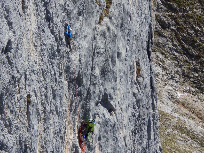 Material: Die Tour ist komplett mit Bohrhaken eingerichtet. In den leichteren Seillängen