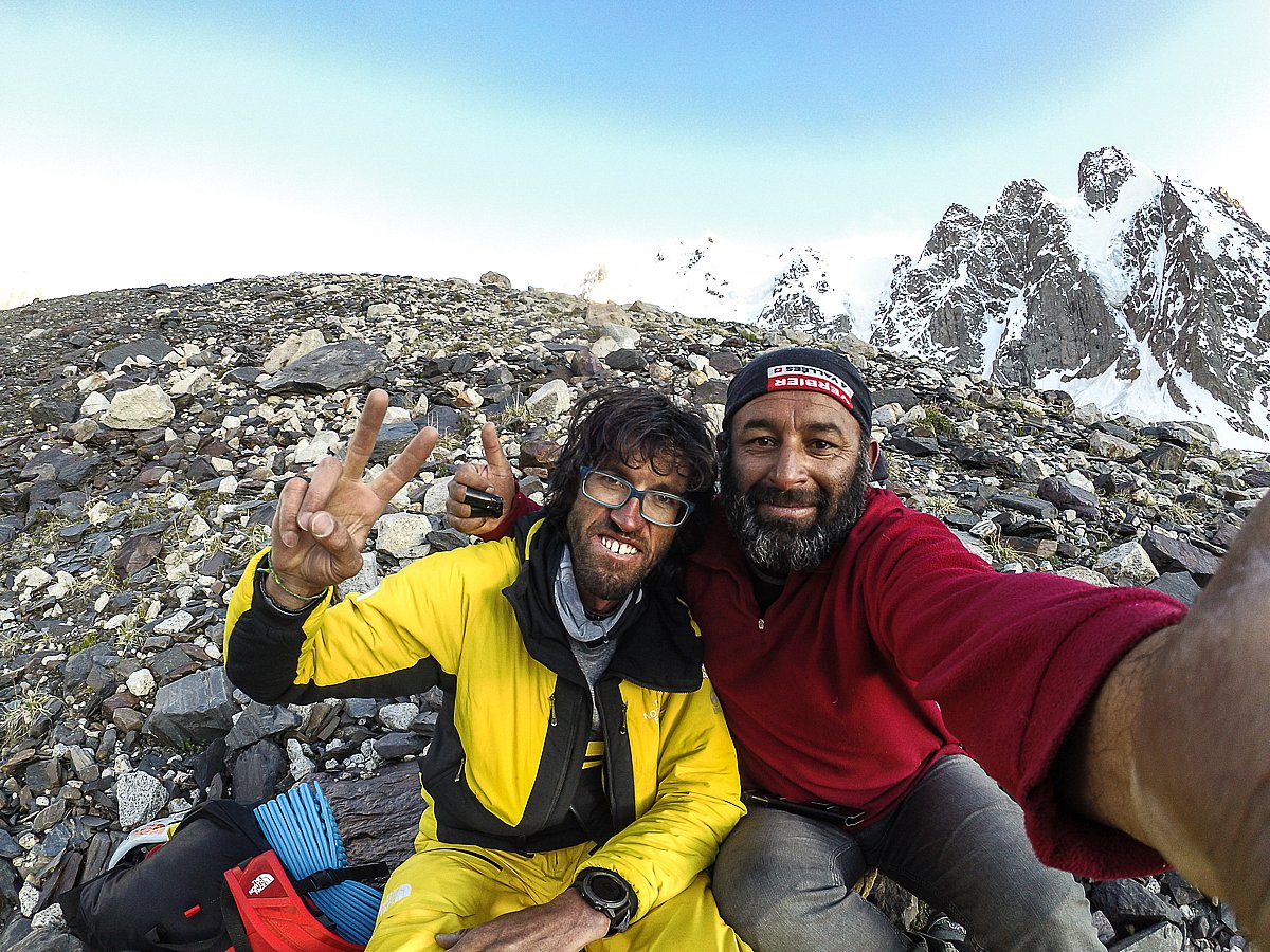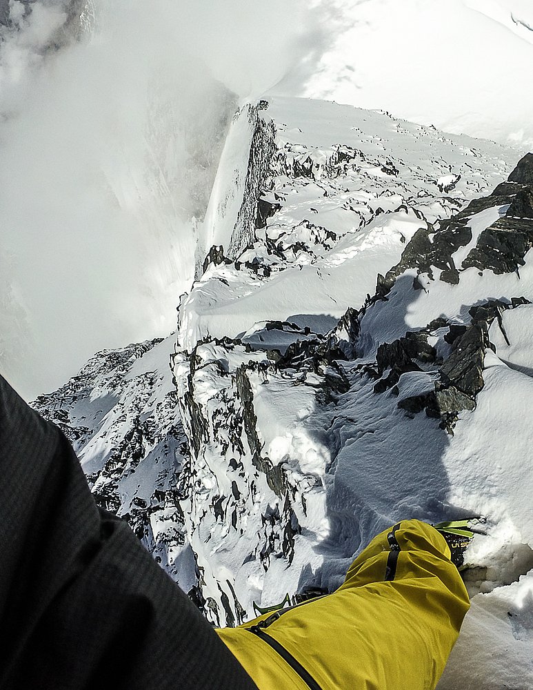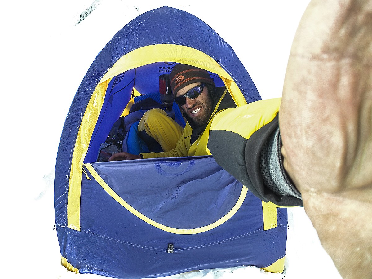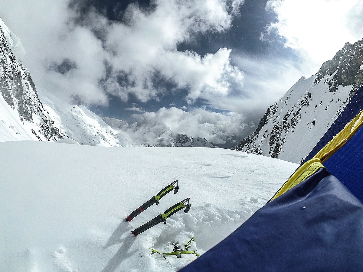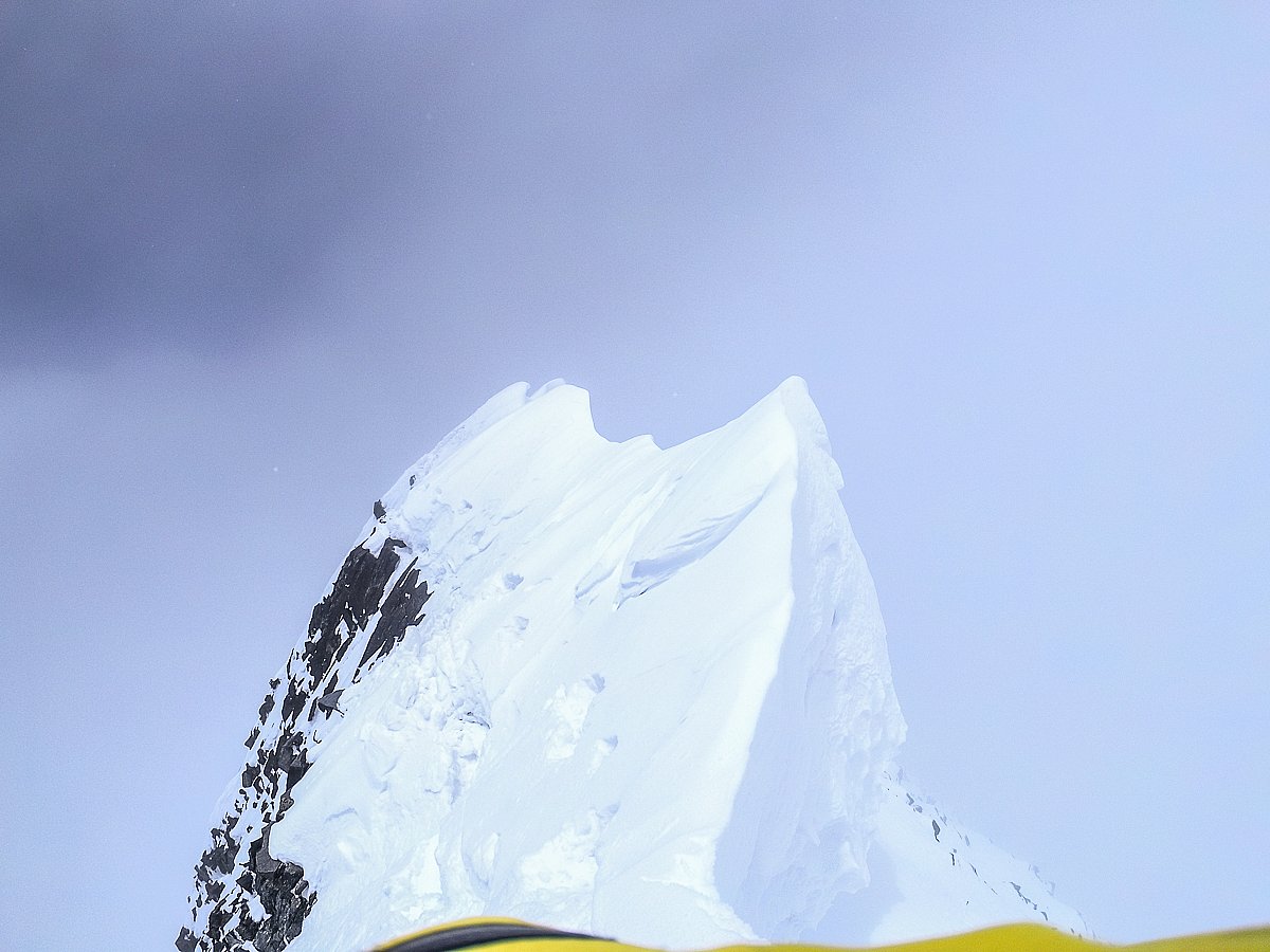 “Zweiter Tag (7. Juli), Start um 5 Uhr. Am Gipfel um 11:30 Uhr. Habe die Biwakausrüstung bis zum Grat mitgenommen, für den Fall eines Schlechtwettereinbruchs. Habe mich dann entschieden gleich weiter zu gehen. Die letzten 200 Höhenmeter brachten kombinierte Kletterei, nicht zu schwer aber in 7000m Höhe und solo doch nicht ohne. Tiefer Schnee zur Gipfel-Wechte, wo ich sicherlich ein wenig an meinem Limit war, da ich leeseitig unterwegs war. Hatte aber nie das Gefühl mich außerhalb meiner Komfort-Zone zu bewegen. Der Abstieg war anstrengend, ich war müde und das Wetter wechselte zusätzlich. Zurück im Basecamp war ich gegen 20 Uhr. Hatte mich entschieden, alles abzuklettern weil ich nur ein 5mm 60m Seil dabei hatte. Das war schneller als nach Abseilstellen zu suchen und an den Blankeis-Stellen Abalakovs einzurichten. Ein paar Mal hätte ich gerne abgeseilt, aber am Ende war alles gut.“