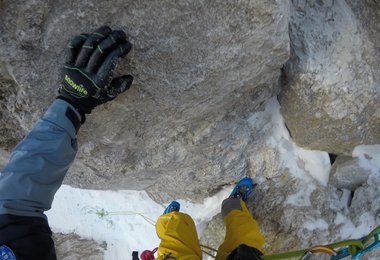 Durch den Lockdown konnte man sich mit dem Auto schlecht bewegen. Da Hermann am Anfang des Langentals wohnt, war er öfters in zum Eisklettern und Skitourengehen in der Puezgruppe. Beim Aufstieg zur Puezspitze befindet sich Richtung Süden der Col Turond mit seiner 620 Meter hohen Nordwand. Hermanns Großvater Battista Mussner ist die Nordwand in den 30 Jahren mehrmals mit Gästen geklettert und auch als Jäger ist der durch die Bänder der Nordwand gestiegen.