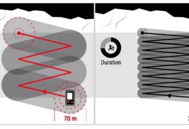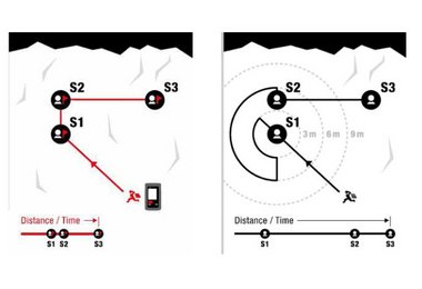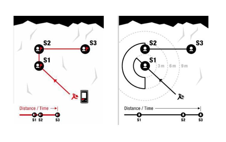 Beeindruckt hat uns vor allem die intuitive Hinweisgebung auf dem mit einem größeren Bildschirm ausgestatteten Barryvox S. Dabei wird dem Suchenden bildlich gezeigt, welchen Schritt (der natürlich abhängig von der Entfernung zum Verschütteten ist) er als nächstes befolgen muss. Ist man z.B. noch weiter vom Ziel entfernt wird am Display die Grobsuche kurz bildlich „erklärt“, ist man in unmittelbarer Nähe zum Verschütteten, so wird man per Bild (auf dem man sieht wie das so ca. funktioniert) zur Feinsuche aufgefordert.