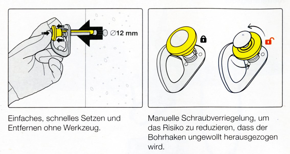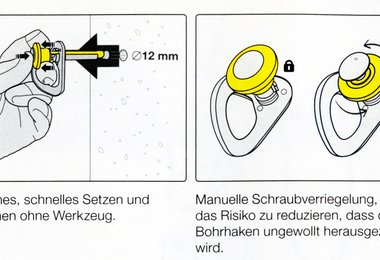 Coeur Pulse - einen 12 mm Bohrhaken, den man setzen und nach Gebrauch wieder entfernen kann. Man (der Kletterer) bohrt ein 6,5 cm tiefes Loch und setzt den Coeur Pulse Bohrhaken ohne Werkzeug hinein. Statt der Schraubmutter gibt es einen mit der Hand bedienbaren Schraubverschluss, der den Bohrhaken quasi verriegelt.
