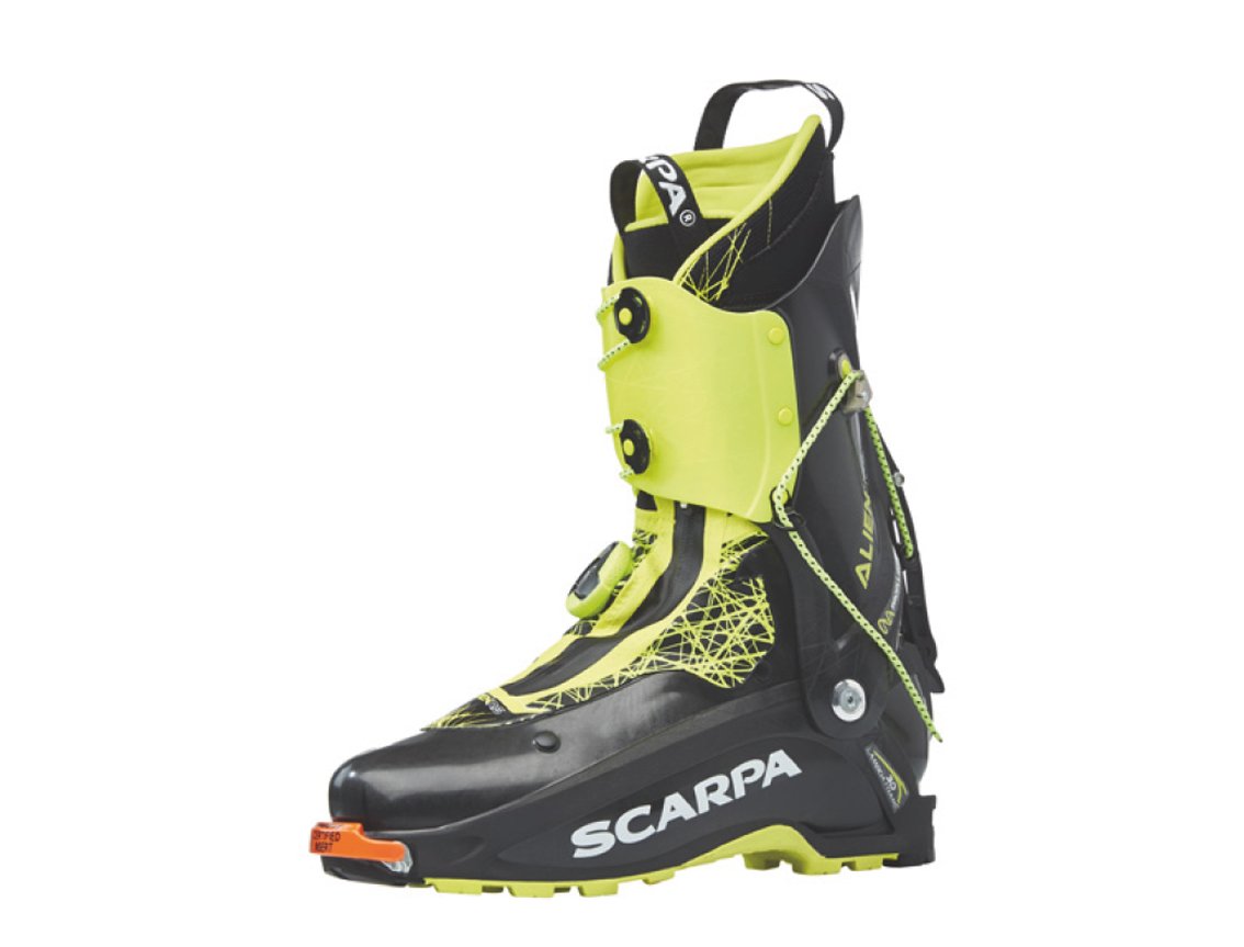 Der gelbe Scarpa Alien Skitourenschuh ist einer der beliebtesten Tourenboots bei den ambitionierten Tourengehern. Die Kombination von Boa-Drehverschuss und Seilzugkipphebel ist legender, der neongelbe Alien Tourenskischuh ist sowohl beim schnellen Aufstieg als auch beim Autofahren (wie mit einem Bergschuh) ein Hit. Der neue Alien RS (schwarz/gelb) wurde etwas überarbeitet, neben dem funktionellen Boa-Verschluss mit nylonummantelten Zugseil und einer eigens für den Alien RS entwickelten Seilführung wurde unten eine Gamasche am Schuh angebracht (mit Zip, damit kein Schnee reinkommt) und oben am Schaft das Reepschnurr-Schnürsystem etwas anders konstruiert.