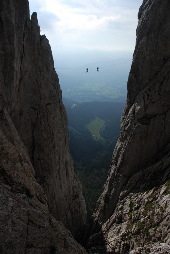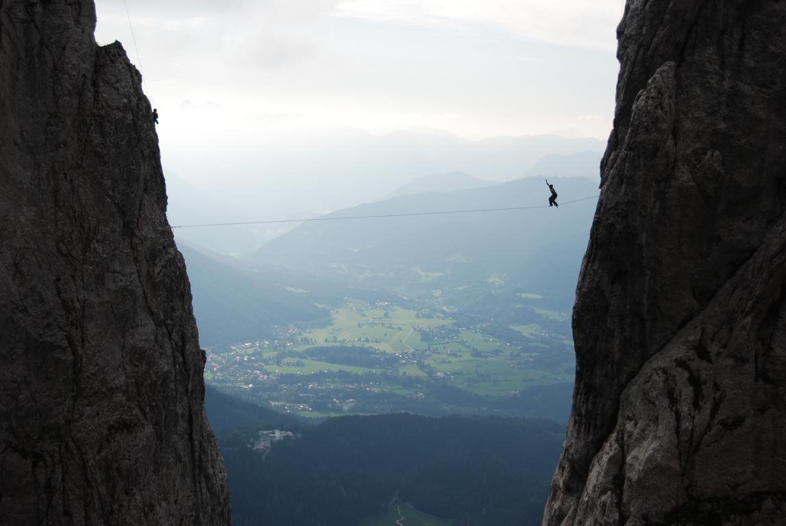Nach einer weiteren Stunde und unzähligen Versuchen schafften wir es die 33 Meter entfernten Fixpunkte der Line zu verbinden. Da wir ein gut eingespieltes Team sind und die Aufgaben klar verteilt sind, waren wir mit dem Aufbau nach kurzer Zeit fertig und saßen am frühen Abend mit Weißbier und Teufelstoast an der Scharitzkehlalm und genossen die Aussicht auf die Wand und die gespannte Line über dem Großen Trichter.