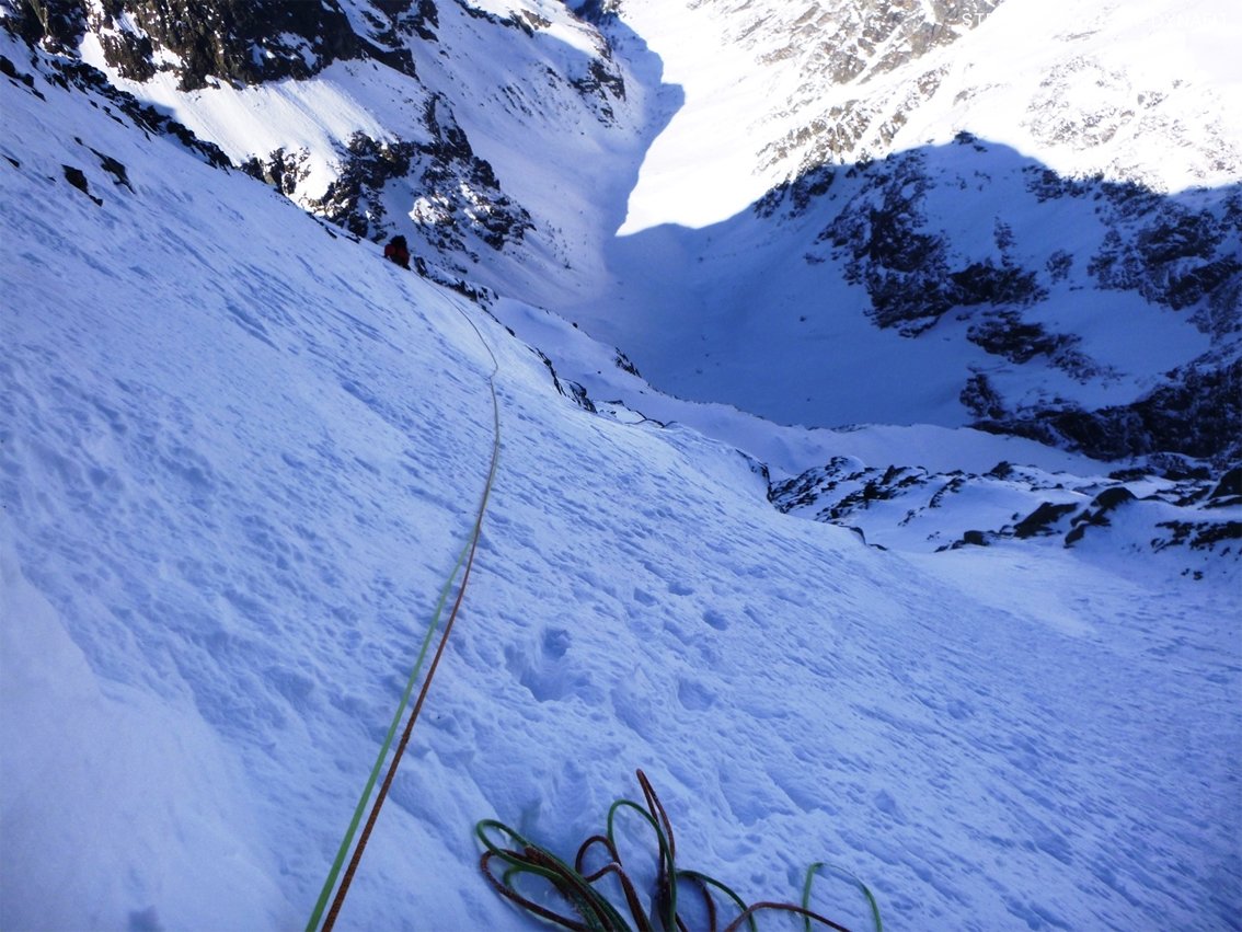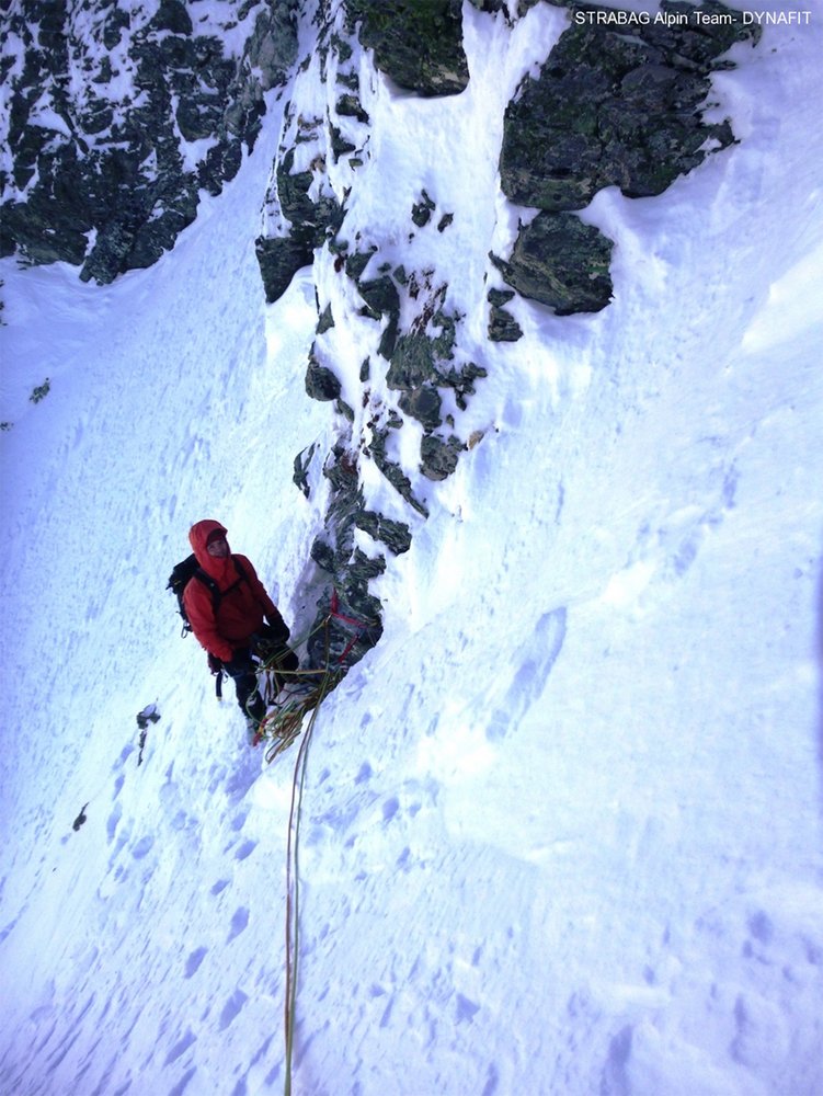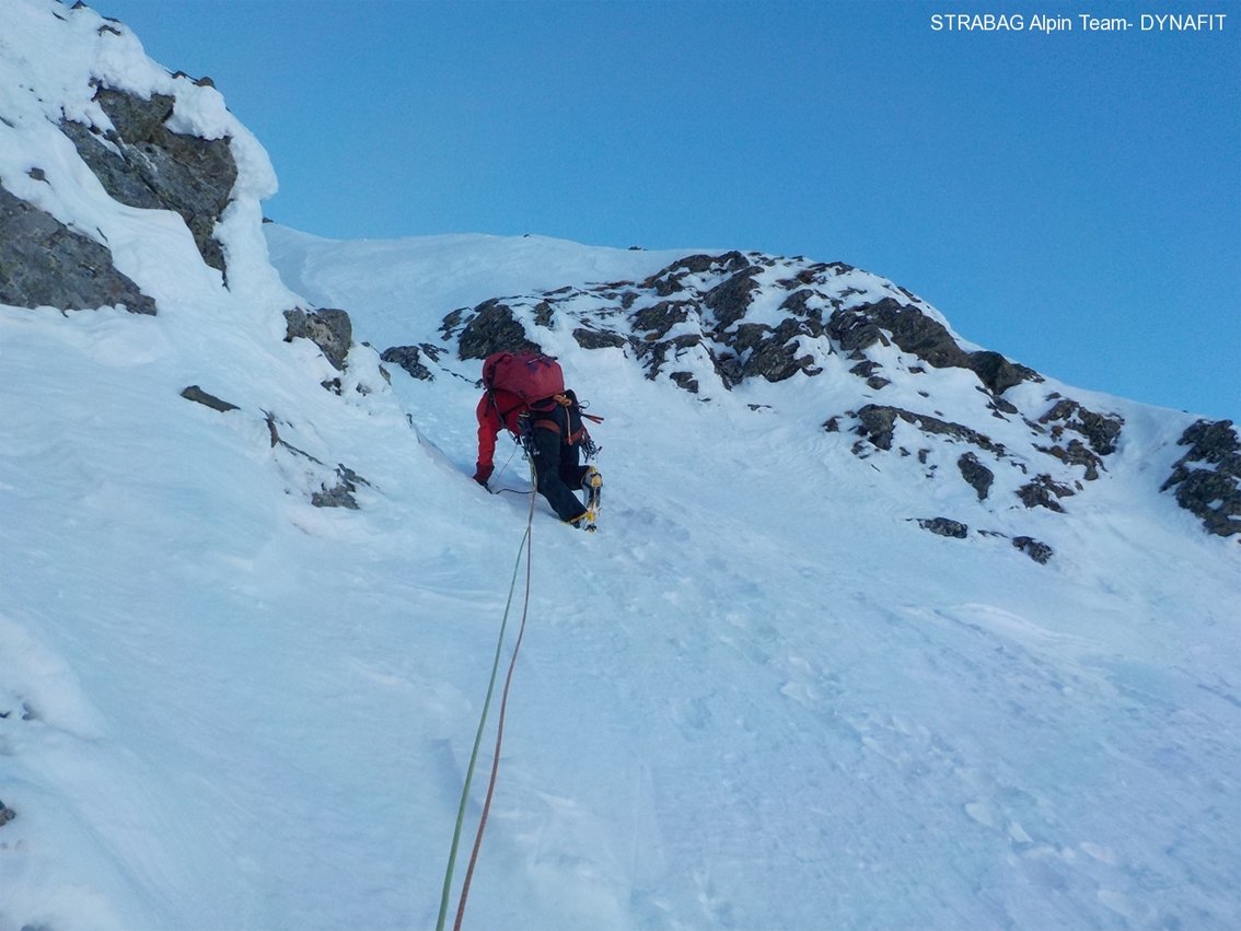 Den sogenannten Eisschlauch, die erste Schlüsselstelle der Route erreichten sie zwar über einen leichten Eisfall (WI 4), aber insgesamt hatte es diese Seillänge doch in sich: dünnste Eisglasuren auf haltlosen Felsplatten, gepaart mit einer abdrängenden Verschneidung, einer griesigen Schneeauflage und fast keinen Sicherungsmöglichkeiten ließen sie diese Länge mit M 6-7 bewerten. Am laufenden Seil spulten sie die kommenden Längen ab und immer wieder, wenn sie glaubten, auf eine Rinne mit festen Schnee zu treffen, wurden sie enttäuscht: kirchdachsteil mit einer oft grundlos dicken Schneegriesauflage auf felsigem Untergrund ließ ihr Tempo in den Keller gehen und trotzdem gingen sie etwa zwei Drittel der Wand am laufenden Seil. Nur wenn es gut ging (und das war echt selten der Fall), konnte Michl Kräftner einen passablen Stand zur Sicherung basteln.