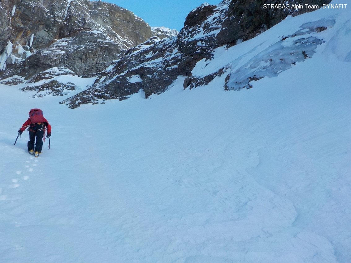 Den zweistündigen Zustieg vom Riesachfall im Untertal zum Einstieg legten die beiden mit Skiern zurück, wobei sie einen ersten Eindruck der Kondition ihres Kletterpartners erhielten - auch nicht ganz unwichtig bei einem Vorhaben dieser Art. Da die Verhältnisse in der Wand von unten schwer auszumachen waren, stiegen sie von links über eine verschneite Rampe in die Wand ein. Schon diese ersten Meter, in denen das Spuren ziemlich anstrengend war, gaben ihnen einen ersten Eindruck davon, was sie in der Wand erwarten könnte.