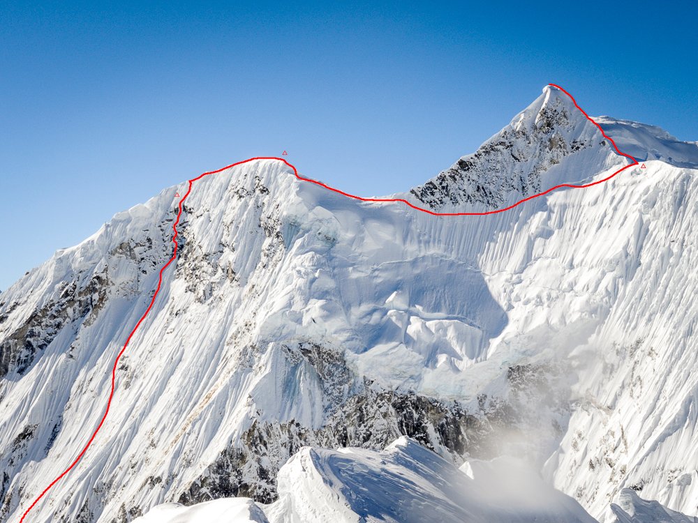 Unterhalb des abschließenden Gipfelgrates fanden Papert und Senf schließlich einen geeigneten Zeltplatz für eine zweite Nacht am Berg. Am nächsten Morgen erwies sich der Grat bei näherer Betrachtung allerdings als nicht kletterbar. Zu viel Neuschnee! Stattdessen traversierten sie durch die Nordwand zur Westflanke. Bei extremer Kälte und starkem Wind musste das Duo erneut für ein paar Stunden Schutz im Zelt suchen. Bei Thomas Senf zeichneten sich bereits erste Erfrierungserscheinungen an den Zehen ab, weshalb der Schweizer beschloss, auf den Gipfel zu verzichten, obwohl dieser schon zum Greifen nah war.