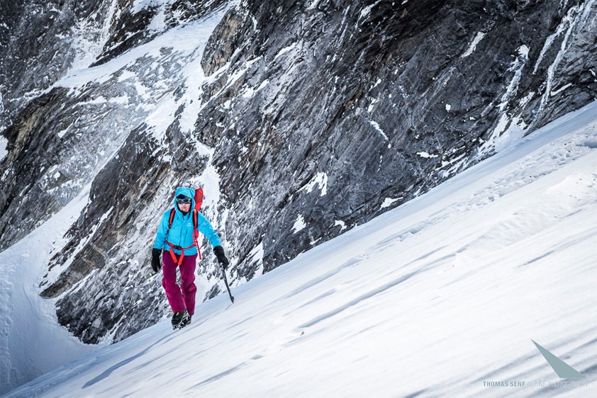 Gegen Mittag machte sich Ines Papert bei weiterhin heftigem Wind auf den Weg. Der Bergschrund war auch im Alleingang zu überwinden, die Kletterei über die 50 - 70 Grad steile Westflanke relativ problemlos seilfrei zu bewältigen. Gegen 14 Uhr erreichte Papert schließlich den Gipfel.
