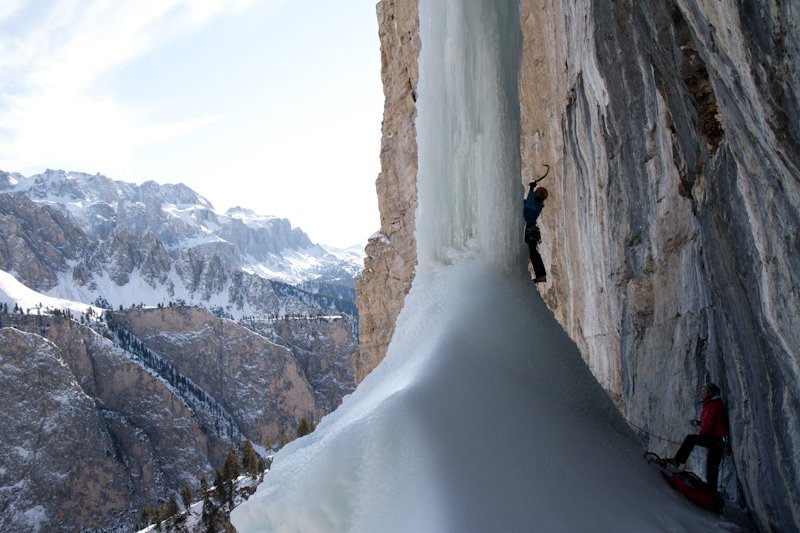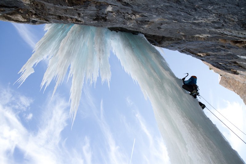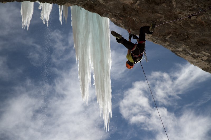 Und ich schaffte das Felsdach, diesmal auf Anhieb. Die Eislängen kletterten wir erst, nachdem sich die Sonne hinter dem Berg verabschiedet hatte. Wir wollten uns nicht in Gefahr bringen, denn immer wieder stürzten Eiszapfen runter.