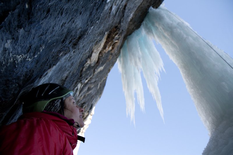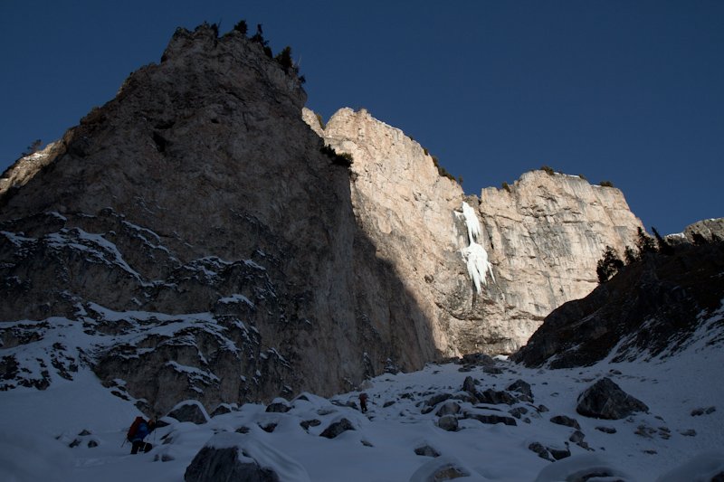 Ein weiteren Versuch unternahm ich 2010 mit der Südtirolerin (und amtierenden Weltmeisterin) Angelika Reiner. Diesmal waren die Temperaturen zu niedrig. Bei minus 20° war an einen Durchstieg im 11. Mixedgrad mit dünnen Handschuhen nicht zu denken. Auch das Eis war wieder sehr dünn, die Säule stand nur minimal am Band auf. Bei derartigen Temperaturen wollte ich einfach nicht mal an die Begehung einer fragilen Säule denken. Aber soweit kamen wir gar nicht.