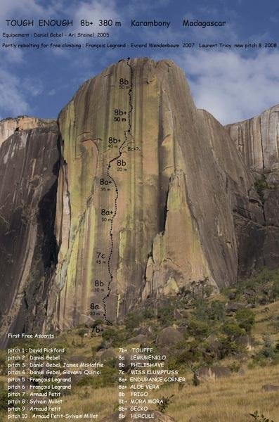 Adam Ondra gelang die erste freie Begehung von Tough Enough (400 m, 8c) in Madagaskar. Kommentar des Erstbegehers zu Adams Leistung: „Though Enough", I was thinking to see that around 2020!!! An other world...."