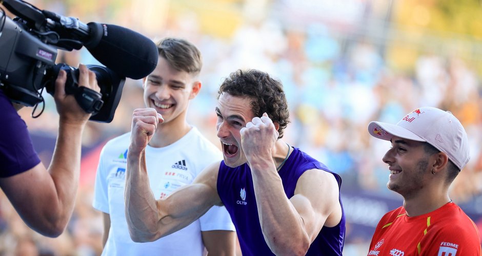 Der Silbermedaillengewinner Potočar hing am 24. Griff senkrecht über dem Boden und feuerte mit der freien Hand das ausverkaufte Publikum unten an, ihn hochzupushen. Das reichte, um ihn auf den ersten Platz zu katapultieren, bevor er von Ondra entthront wurde.
