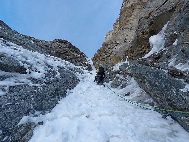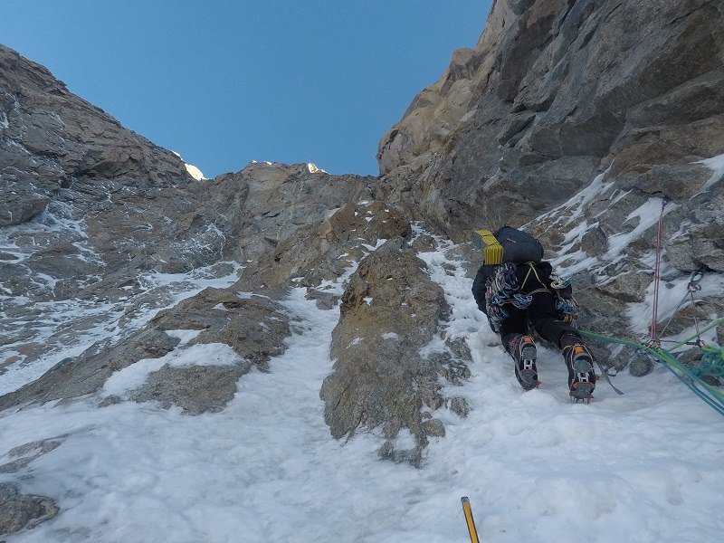 Das Japaner Couloir verläuft direkt in der Schlucht zwischen der Pointe Walker und Pointe Whymper und wurde 1972 von einem achtköpfigen japanischen Team in 32 Tagen im Expeditionsstil erstbegangen. Seit der ersten Wiederholung im Jahr 2008! wurde diese Routen bisher nur sehr selten gemacht. Roger Cararach Soler und seine Freunde wollten zwar ursprünglich in der Wand biwakieren, entschieden sich aber aufgrund der fehlenden Bänder für den Aufstieg bis zum Gipfel den sie im 1 Uhr morgens erreichten.