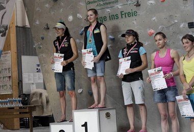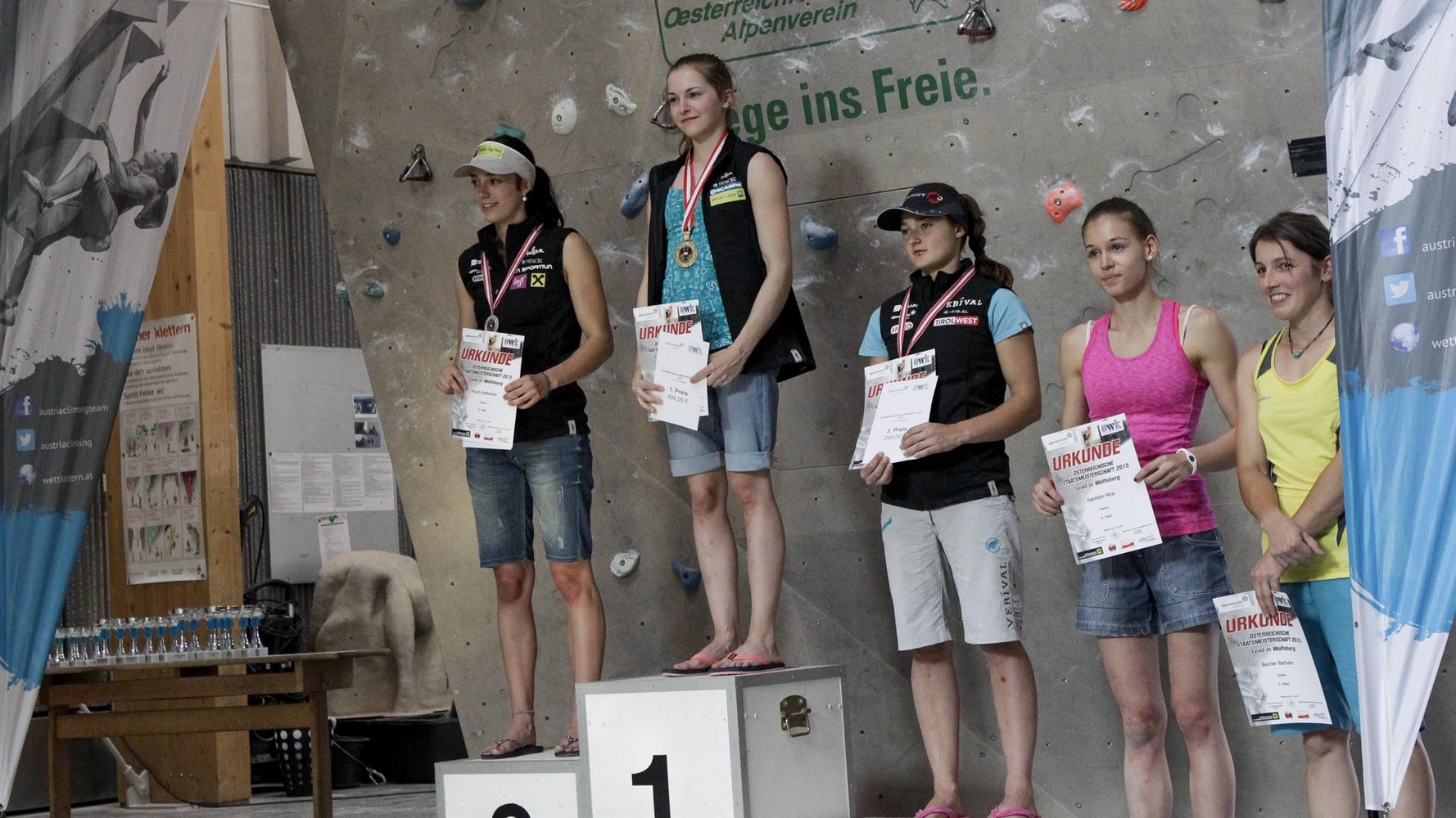 Bei den Damen war aufgrund des starken Teilnehmerfelds Weltcupfeeling angesagt. Mit Magdalena Röck (OeAV Innsbruck), Katharina Posch (OeAV Imst-Oberland), Jessica Pilz (OeAV Amstetten-Haag) und Barbara Bacher (OeAV Innerötztal) waren gleich vier Athletinnen am Start, die in den Top-20 der Weltrangliste aufscheinen. Im Finale kam es dann auch zum erwarteten Showdown um den Staatsmeistertitel. Magdalena Röck, nach der Qualifikationsrunde auf Platz 3, übernahm im Finale mit einer Höhe von 22+ die Zwischenführung vor den Auftritten der ex aequo Qualifikationsführenden Jessica Pilz und Katharina Posch. Jessica Pilz, die eine Woche zuvor noch den Heim-Europacup krankheitsbedingt auslassen musste, kämpfte sich in der Finalroute bis zur Wertung 29+ und übernahm damit die Führung von Röck. Katharina Posch meisterte die schwierige Finalroute beinahe gleich gut wie Pilz und erreichte mit eine Höhe von 28 den zweiten Platz und somit ÖSTM-Silber. Staatsmeisterschafts-Gold ging somit erstmals an Jessica Pilz, die Magdalena Röck als amtierende Staatsmeisterin im Vorstieg ablöst und ebenso wie Georg Parma zum Kreis der Favoritinnen zählt bei den bevorstehenden Junioren-Europameisterschaften im schottischen Edinburgh.