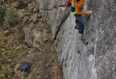 Und nach dieser Stelle ist es noch nicht vorbei. Bis zum Umlenker gilt es noch 7 Meter im Achten Grad zu bewältigen. Und damit es nicht allzu langweilig wird, stecken hier natürlich keine Haken mehr. Mobiles Gerät lässt sich zwar sehr gut legen, aber die Kletterei bleibt trotzdem unsicher und wackelig. Ich kenne so manche „Altmühltalgröße“, die hier noch unfreiwillig die Reise nach unten angetreten hat…