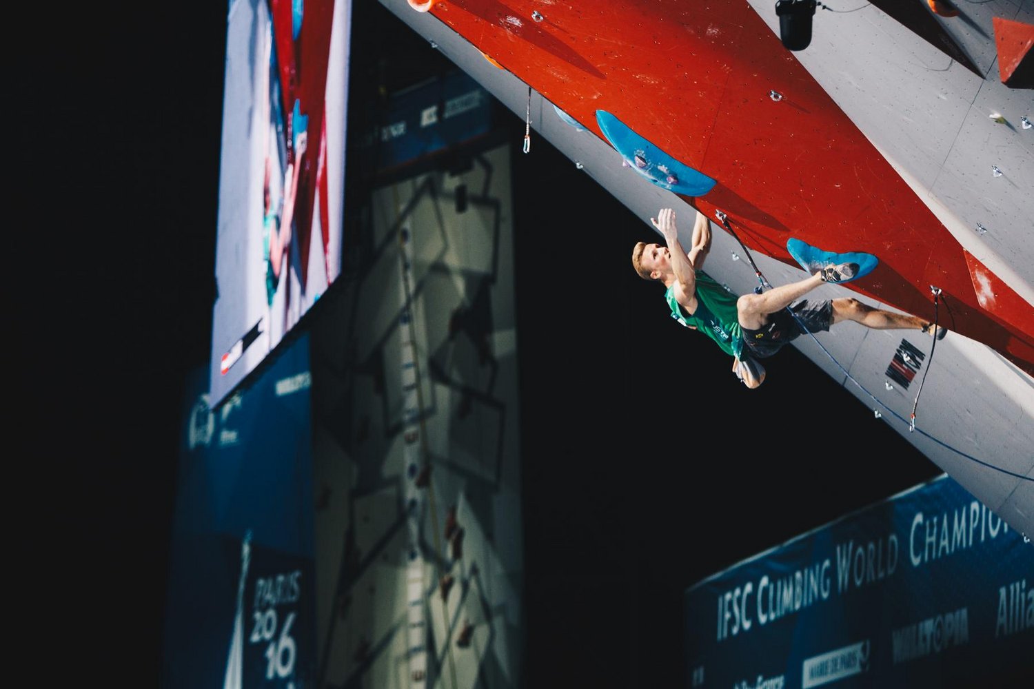 Paris (FRA): Das Vorstieg Finale der Herren am fünften und letzten Tag der Kletter-WM 2016 in Paris war eine Show der Superlative der besten Seilkletterer der Welt. Grundlage für das Spektakel war eine Finalroute die alles zu bieten hatte. Schwierige Boulderpassagen, spektakuläre Sprünge sowie eine einzigartige Ausstiegsplatte boten den Athleten eine einmalige Bühne um ihr Können vor rund 9.000 Zusehern unter Beweis zu stellen.
