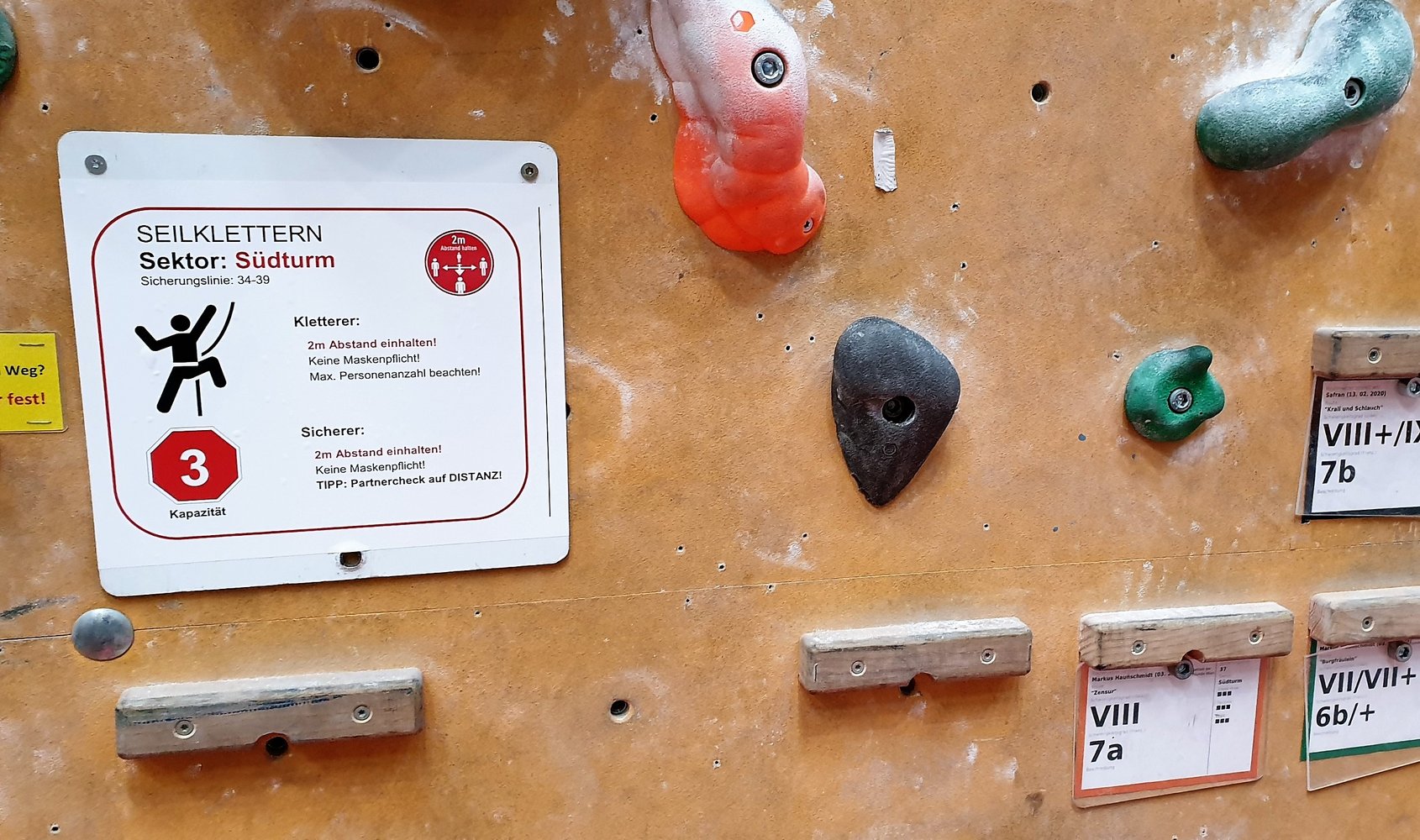 Wichtig: Die Einhaltung der Abstandsregeln in der Praxis ist sehr ernst zu nehmen, und diesbezüglich werden von Kletteranlagenbetreibenden auch Maßnahmen ergriffen, die eine Einhaltung dieser Regeln gewährleisten.