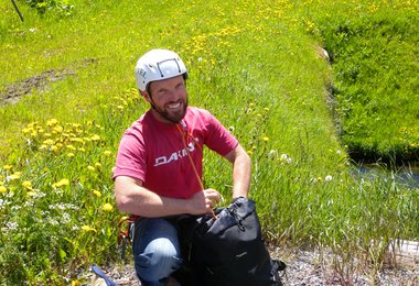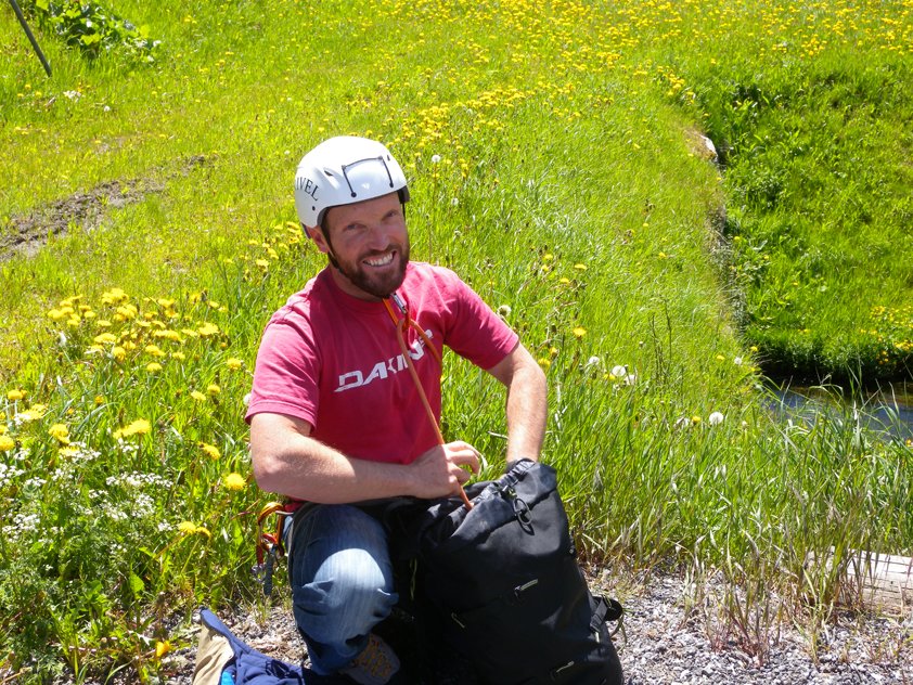 Das Seil im Rucksack, oben hängt eine Schlinge heraus - so geht's: Man nimmt das Seil, legt es offen, ohne Knoten neben den Rucksack. Dann stopft man es wie beim "druch die Hand-Druchziehen" Meter für Meter in den Rucksack, so dass am Schluss nur noch ein Seilende herausschaut. Um diesen Vorgang zu erleichtern, kann man sich am Kinnband des Helms einen Karabiner einhängen und bekommt so das Seil noch einfacher in den Rucksack.