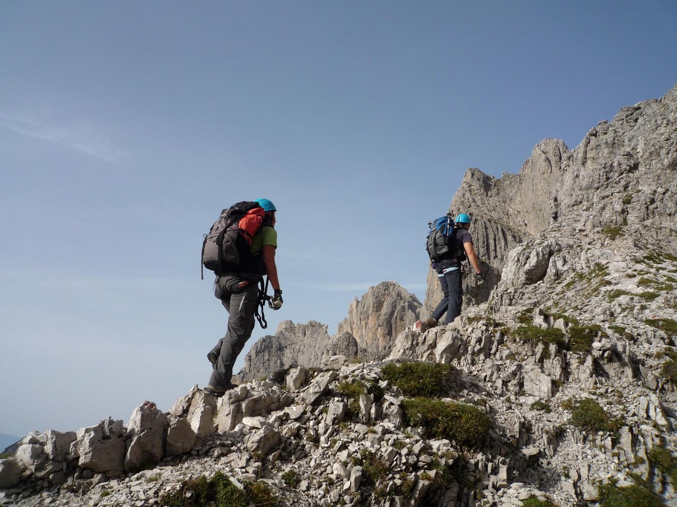 Gemütlich queren wir hinauf zum Einstieg der Ferrata Sperti, dem wildesten und längsten Schiara-Steig. Die ersten 200 Höhenmeter lassen dies aber noch nicht erkennen und leiten in mäßiger Schwierigkeit bis maximal B hinauf auf die Grasterrasse mit einem roten Blechkasten, dem Bivacco Sperti. Dort genießen wir die bereits großartige Aussicht und folgen dem gestuften Grat mit der klettertechnisch schwersten Stelle (B/C) zur ersten Schlucht, überqueren diese nach links zur wilden Hauptschlucht, durch die der Steig in direkter Linie über Blöcke und Leitern zur Forcella Sperti hinaufzieht. Dort wechseln wir die Bergseite und klettern in einem steten Auf und Ab zur Forcella della Gusela, in der die gleichnamige imposante Felsnadel das Auge – und das Kameraobjektiv auf sich zieht.