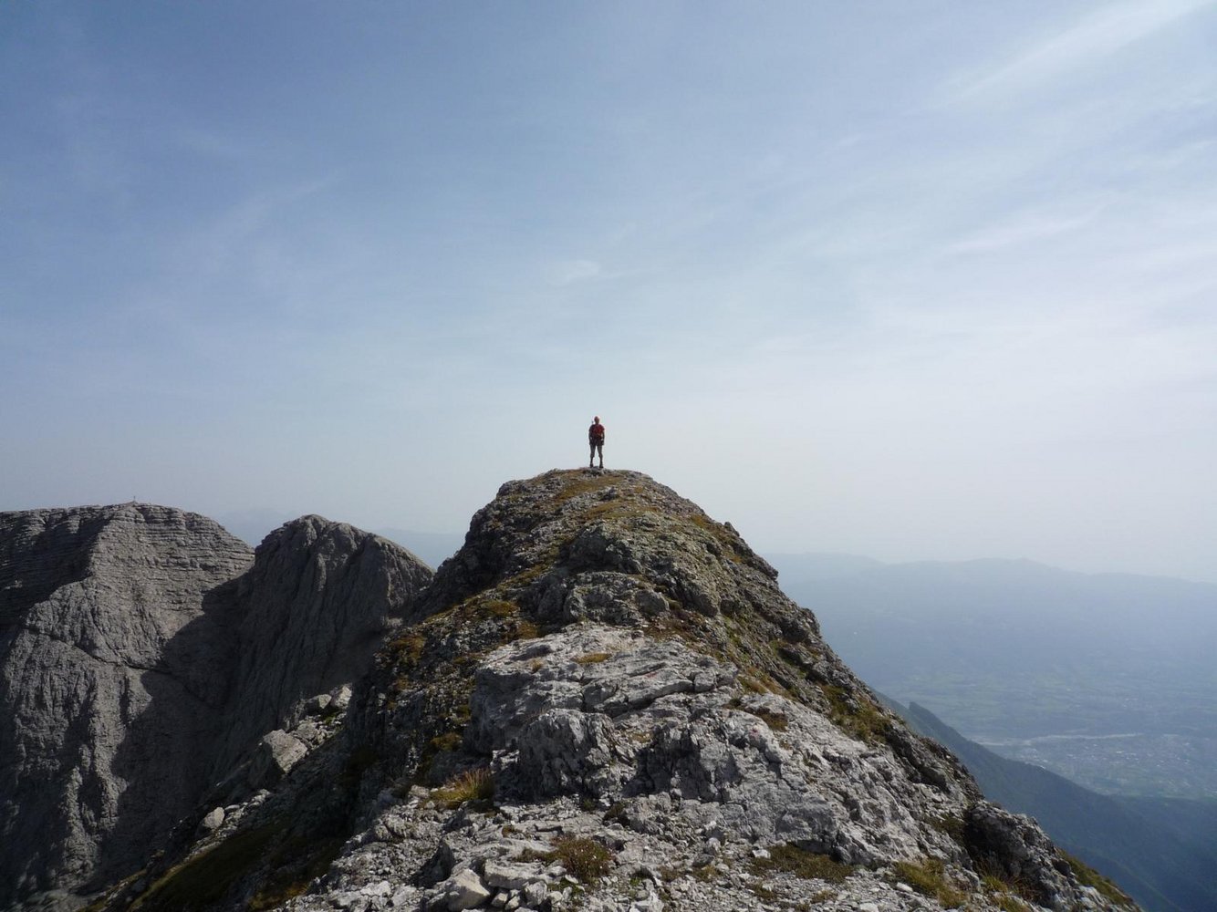 Über die bereits bekannte Ferrata Berti gelangen wir in die Forcella Marmol, wo sich der Monte Pelf, unser nächstes Ziel, gleich senkrecht aufstellt. Geschickt leitet uns das Stahlseil durch die Schwachstellen dieser senkrechten Wand hinauf zum Grat, wo sich der Sentiero attrezzato Marino Guardiano gleich zurücklegt und dem Kamm über einige versicherte, aber leichte Felsstufen zum Gipfel folgt. Nach kurzer Rast steigen wir über den steilen, mit Edelweiß übersäten Wiesenrücken hinunter zur Forcella Pis Pilon, biegen kurz davor nach links zum Bivacco Medassa ab und tauchen bald wieder in den dichten Laubwald ein, der den alpinen Schiarakessel mit der mittelitalienischen Ebene verbindet. Beim Weiler Case Bortot angekommen ist unser Auto natürlich unversehrt, als hätte der Wald die ganze Zeit darauf aufgepasst.