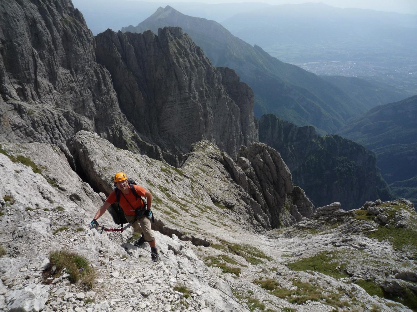 Am nächsten Tag sind wir schon in aller Früh Richtung Ferrata Zacchi unterwegs. Der Weg dorthin und die ersten Klettermeter sind uns bereits von gestern bekannt, da diese mit der Ferrata Marmol identisch sind. Auf einem kleinen Latschenabsatz nach der Einstiegswand trennen sich aber die beiden Steige und die Zacchi zeigt gleich mit der ersten Schlüsselstelle, einer senkrechten, nur mit einem Seil gesicherten Rinne, dass man in diesem Abschnitt etwas mehr auf Zack sein muss. Ein schöner, lang gezogener, vorgelagerter Gratrücken lädt danach noch einmal zum Verschnaufen ein, bevor sich die Wand senkrecht aufstellt. Der steile Schlusspfeiler, die zweite sehr luftige Schlüsselstelle ist gespickt mit Leitern und führt in einen kleinen Geröllkessel. Auf einem schmalen Band, welches uns wieder an die Bänder im Zentrum der Dolomiten erinnert, geht es zum Bivacco Bernardina. Das Wetter ist traumhaft, was laut Hüttenwirt aber keine Selbstverständlichkeit ist; denn nur allzu oft staut sich die feuchte Meeresluft an den ersten großen Erhebungen der Alpen, womit auch das vermeintliche Überangebot an Biwakschachteln gerechtfertigt erscheint.