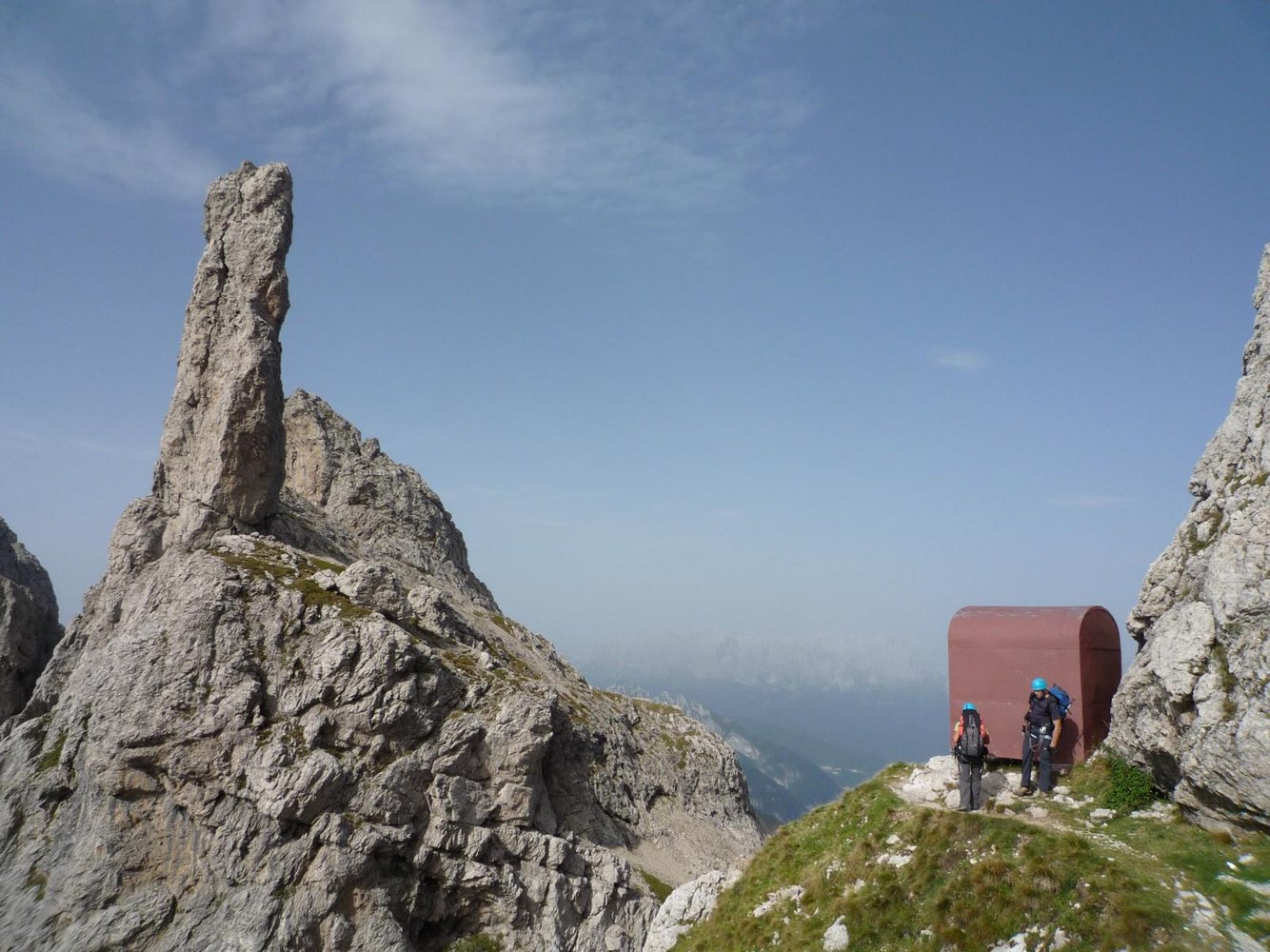 In der Forcella della Gusela steht auch das Bivacco Bernardina. Dort treffen wir auf zwei schweißgebadete Ferrata-Zacchi-Bezwinger aus Italien, die von dem steilen Schlusspfeiler schwärmen. Gemeinsam, fast froh auch auf andere Bergsteiger gestoßen zu sein, machen wir uns auf den Weiterweg, über die Ferrata Berti zum höchsten Punkt der Schiaragruppe. Die Berti wurde vor 50 Jahren gemeinsam mit dem Biwak errichtet und ermöglicht seither auch dem Nichtkletterer die sichere Überschreitung des 2565 Meter hohen Monte Schiara. Schon nach wenigen Gehminuten stellt sich der Berg bereits steil auf und Leitern helfen uns zum höchsten Punkt, von dem wir hindernislos auf die beliebten Badeziele der Adria blicken. Im Norden sticht die Civetta ins Auge und erinnert uns wieder daran, dass wir ja eigentlich in den Dolomiten sind. Der Abstieg zum Bivacco Marmol ist problemlos und braucht einzig bei dem plötzlich kurz vor dem Biwak auftauchenden Felsspalt etwas Aufmerksamkeit. Vom Biwak steigen wir die Ferrata Marmol ab, die 1966 als Entschärfung für den alten Abstieg von der Forcella Marmol durch den »Canalone« zum Rifugio 7° Alpini errichtet wurde, weil der alte Abstieg vielen Weitwanderern, die geschwächt vom nördlich liegenden Rifugio Pramperet kamen und vor der Schlucht standen, auf dem Dolomiten-Weg Nr. 1 zum Verhängnis wurde.