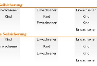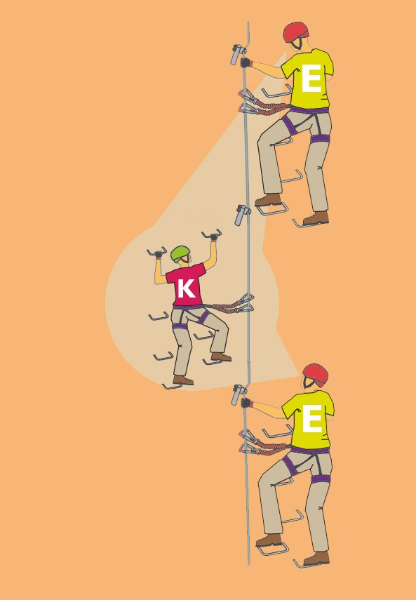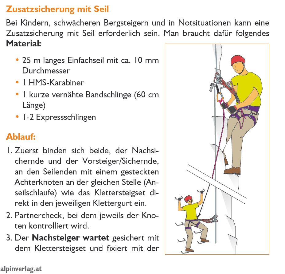 Daraus ergibt sich, dass Erwachsene, die mit Kindern einen Klettersteig begehen, auch selber in der Lage sein müssen (Erfahrung, Können, Kondition und pädagogische Kompetenz) das Kind zu führen.