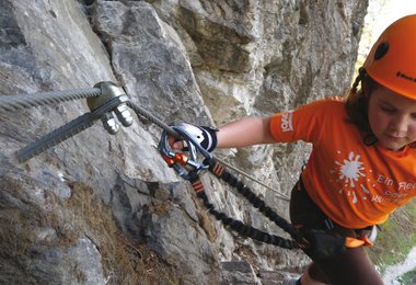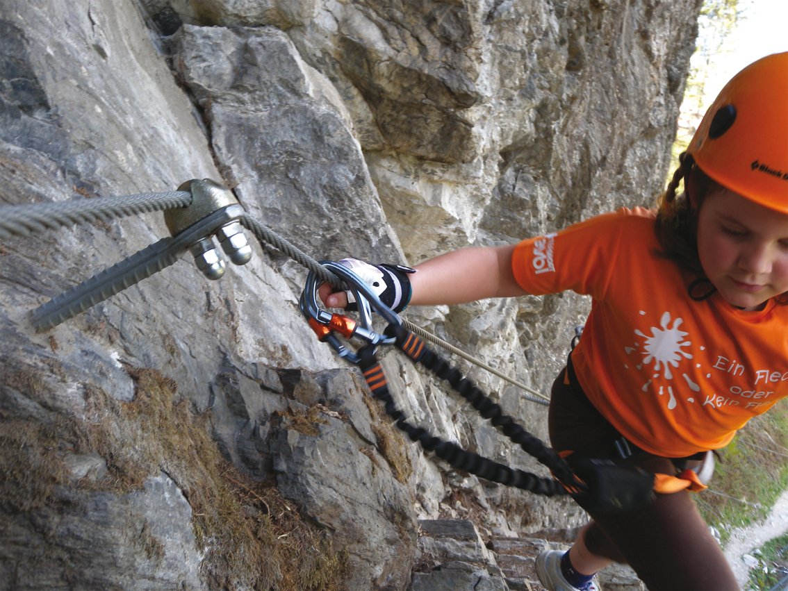 Sicherheit: Grundsätzlich ist es bei Kindern noch wichtiger, dass ein Sturz in das Klettersteigset vermieden wird. Auf den korrekten Karabinerverschluss ist bei Kindern besonders zu achten!