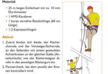 Bevor es mit den Kleinen losgeht, empfi ehlt sich ein „Trockentraining“ auf einem kurzen Übungsklettersteig. Dabei macht man Kinder mit der Ausrüstung vertraut, nimmt ihnen behutsam die Angst vor der Höhe und hat natürlich bereits jede Menge Spaß. Auf dem echten Klettersteig müssen Kinder, ausgehend vom oben genannten Grundsatz des Nichtstürzens, unbedingt immer geführt werden. Dies kann abhängig vom Alter in unterschiedlicher Art und Weise erfolgen.