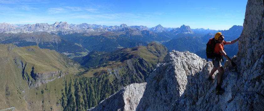 Die Sella flankiert von Pässen ist sicher der bekannteste Dolomitenstock. An der Nordseite befindet sich auch die meistbegangene Via ferrata in den Dolomiten. Die Berühmtheit des Pisciadù-Klettersteigs ist vollkommen gerechtfertigt, denn der Steig bietet einen kurzen Zustieg, fordernde, aber niemals besonders schwierige Passagen in einer Kulisse, die ihresgleichen sucht, imposante senkrechte Kletterpassagen am Exnerturm, eine Hängebrücke und eine bewirtschaftete Hütte mit Bergsee beim Ausstieg. Der Klettersteig ist der Auftakt für die Sella-Durchquerung, große Gruppen machen das Überholen fast unmöglich. Man sollte jedenfalls etwas Zeit einplanen, insbesondere an Wochenenden Staugefahr. Wer es genießen will, kommt an einem Wochentag oder steigt später ein. Bevor man sich auf den landschaftlich schönen Abstieg durch das Mittagstal begibt, kann man noch die Cima Pisciadù, 2985 m erklimmen.