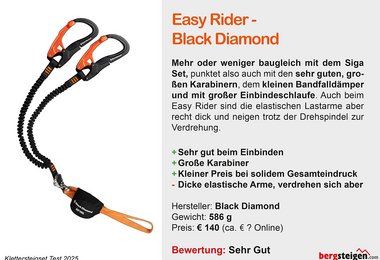 Black Diamond "Easy Rider“: Das Easy Rider Klettersteigset war vor vielen Jahren mit seinen futuristischen Karabinern eine Legende und wurde jetzt neu aufgelegt. Es ist quasi baugleich mit dem Siga Klettersteigset von Rock Empire, außer die Farbgebung wurde dem alten Easy Rider Set angeglichen. Absolutes Highlight sind die sehr großen, sehr gut zu bedienenden Karabiner, ein kleiner Bandfalldämpfer der an einer großen Einbindeschlaufe hängt (die Einbindeschlaufe ist minimal kleiner als beim Siga Klettersteigset, das Ein- und Ausbinden geht damit perfekt) zeichnen dieses Klettersteigset aus. Auch das Easy Rider Klettersteigset neigt etwas zur Verdrehung. Es gibt eine Metallöse für den Kurzfixkarabiner. Beim Einsatz am Klettersteig funktioniert das Easy Rider Klettersteigset aber sehr gut, in der Preisgestaltung ist das Black Diamond Easy Rider Set mit 140 Euro auch im unteren Bereich, weshalb es sicher gut angenommen wird. Erhältlich vrs. ab Sept. 2025.