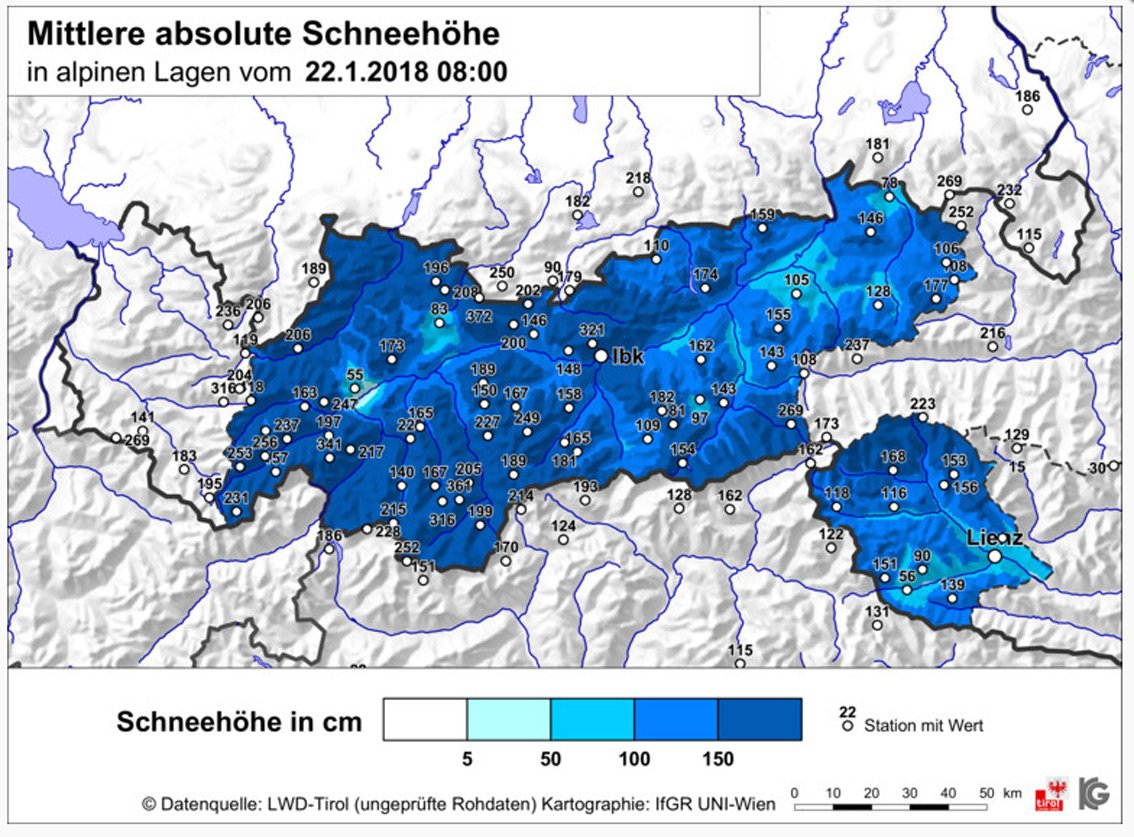 Auch in fast allen anderen Tiroler Gebirgsgruppen ist die Lawinengefahr mit Stufe 4 (groß) hoch. An Skitouren ist in diesen Regionen überhaupt nicht zu denken, in den Regionen mit Stufe 5 (sehr groß) herrscht quasi der Ausnahmezustand. Sehr viele Straßen sind gesperrt und zahlreiche Orte sind von der Außenwelt abgeschnitten. Wetterberuhigung ist erst wieder für Mittwoch in Sicht.