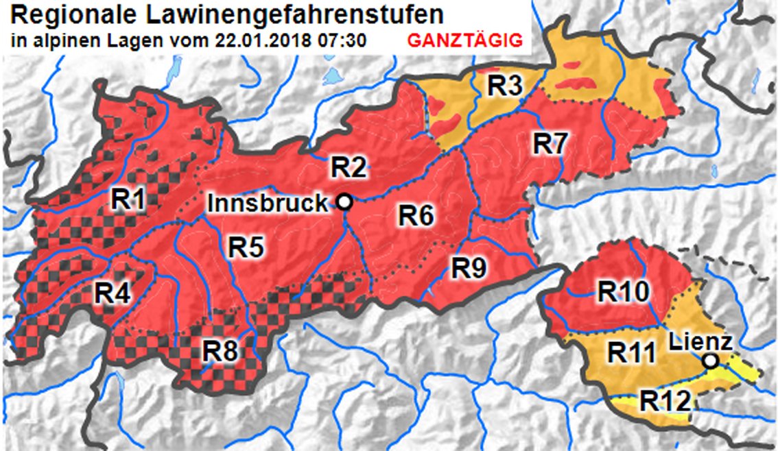Es kommt sehr selten vor, dass der Lawinenwarndienst die Stufe 5 (sehr groß) ausgibt - am 22.01. um 7:30 Uhr war es wieder einmal soweit. In den Hochgebirgsregionen von Tirol ist die Karte rot/schwarz eingefärbt. Betroffen sind die Stubaier- und Ötztaler Alpen sowie die Silvretta und die Lechtaler Alpen.
