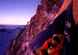 Am nächsten Tag kletterten Sie zum Fuß der eigentlichen Granitwand und errichteten hier unter den Überhängen ein geschütztes Basislager. Sie entschieden sich für einen Jo-Jo Technik, bei der sie jedes Mal wieder in diese Lager abstiegen. So vermieden Sie das im Mixed Gelände gefährliche Nachziehen der Haulbags.
