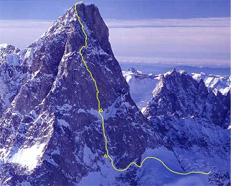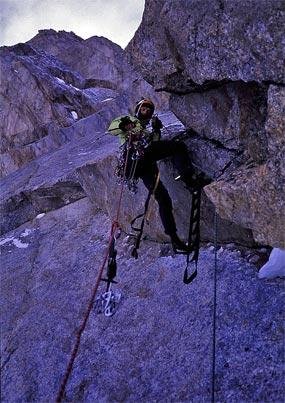 Vom 'Basilager' kämpften sie sich in acht Tagen die 320 m hohe Granitwand (A3 M5 6a) und den anschließenden 200 m delikaten Gipfelbereich (M2), wobei sie nach der dritten Längen zweieinhalb Längen gemeinsam mit der Groucho Marx kletterten, um nicht Bohrhaken verwenden zu müssen.