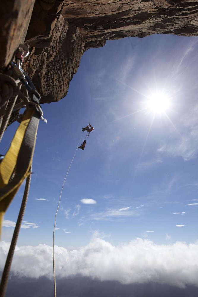 So war bereits der Anmarsch ein Abenteuer für sich. Eine passagenweise senkrechte, über 800 Meter hohe Dschungelbarriere warf das Team in ihrem Zeitplan weit zurück, der unglaublich intensive Regen tat sein Übriges. Riesige Wasserfälle stürzten über die Wand und machten das Klettern für Tage unmöglich. Bis zur Wandmitte, anspruchsvollstes Gelände im oberen neunten Schwierigkeitsgrad – kämpften sich Stefan Glowacz und sein Team. Dann mussten sie resigniert den Rückzug antreten. Die letzten Reste der Trockennahrung waren aufgebraucht, der mühevolle Anmarsch forderte seinen Tribut.