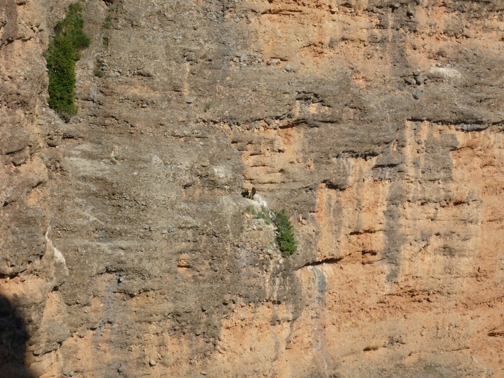 Wie Kartoffeln stehen die abgerundeten mehr oder weniger großen Kieselsteine aus der Wand heraus – der Vergleich mit typischen Kunstwänden kommt auf und hinkt auch nicht: Auf weißen, von weitem schon gut sichtbaren Magnesiumbahnen klettert man mit viel Übersicht die Aufleger- und Henkelpartie hoch, unterbrochen nur von teilweise richtig ungemütlichen Hängeständen und dem Geschrei der– je nach zurückgelegten Klettermetern - über oder unter einem kreisenden Geier. Diese sind auch verantwortlich für die weißen Flecken in den Wänden: einst Nester und Fäkalstätten der bis zu 2m Spannweite messenden Vögel, halten sie heute vereinzelt als (etwas grausliche) Standplätze her (z.B. in der „Zulu Demente“ auf die „Visera“).