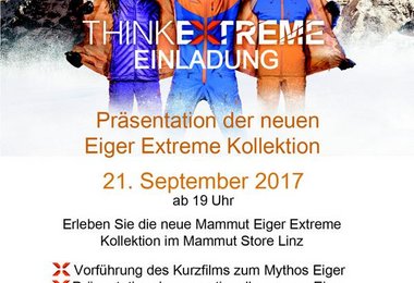 Am 21. September 2017 wird die neue Mammut Eiger Extreme Kollektion in den Mammut Stores in Linz und Innsbruck vorgestellt - Beginn ist jeweils um 19:00 Uhr (Anmeldung bis zum 15. September 2017 im jeweiligen Store notwendig). Als Zuckerl gibt es dabei für alle Eiger-Nordwand-Bezwinger ein Eiger Extreme Messer und ein T-Shirt! Mehr Infos zu dieser Veranstaltung gibt es bei den Terminen!