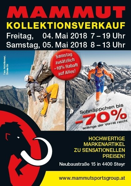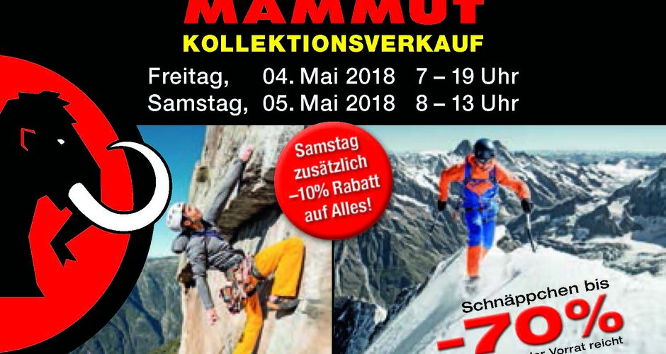 Wie jedes Jahr gibt es bei Mammut Österreich den legendären Kollektionsverkauf. Diesen Frühling findet er offiziell vom 04. bis 05. Mai statt. Neben Schnäppchen bis -70% gibt es auch eine große Auswahl an Produkten aus dem gesamten Produktsortiment von Mammut.