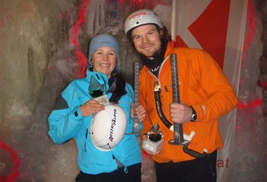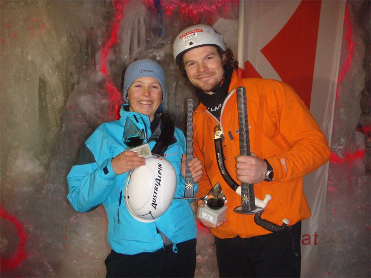 Das Ergebnis war auch ein schöner Erfolg für den Hardwarehersteller Austrialpin – beide Sieger klettern mit Austrialpin-Eisgeräten…