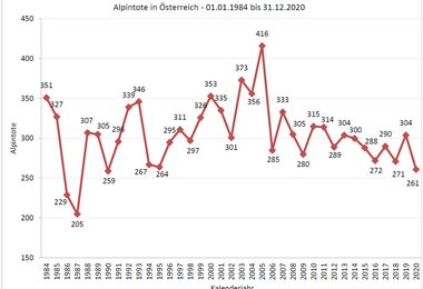 Wie aus der Alpinunfallstatistik des Österreichischen Kuratoriums für Alpine Sicherheit (ÖKAS) / BM.I Alpinpolizei hervorgeht, sind im Jahr 2020 zwischen 1. Januar und 31. Dezember 261 Menschen in Österreichs Bergen ums Leben gekommen. Das Zehnjahresmittel liegt bei 290 Toten pro Jahr. Im Jahr 2020 starben österreichweit 42 Frauen (16%) und 219 Männer (84%) am Berg.