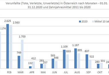 Im Jahr 2020 sind 7.466 Verletzte in der Alpinunfalldatenbank zu verzeichnen; etwa 500 Verletzte mehr als im Vorjahr 2019. Das 10-Jahresmittel liegt bei 7.525. Insgesamt verunfallten (Tote, Verletzte, Unverletzte) im Jahr 2020 11.290 Personen (Mittel 10 Jahre: 11.446). Im Zeitraum der Ausgangssperren im März und April 2020 verunfallten in diesem Zeitraum ca. 1.200 Personen weniger als im langjährigen Mittel.